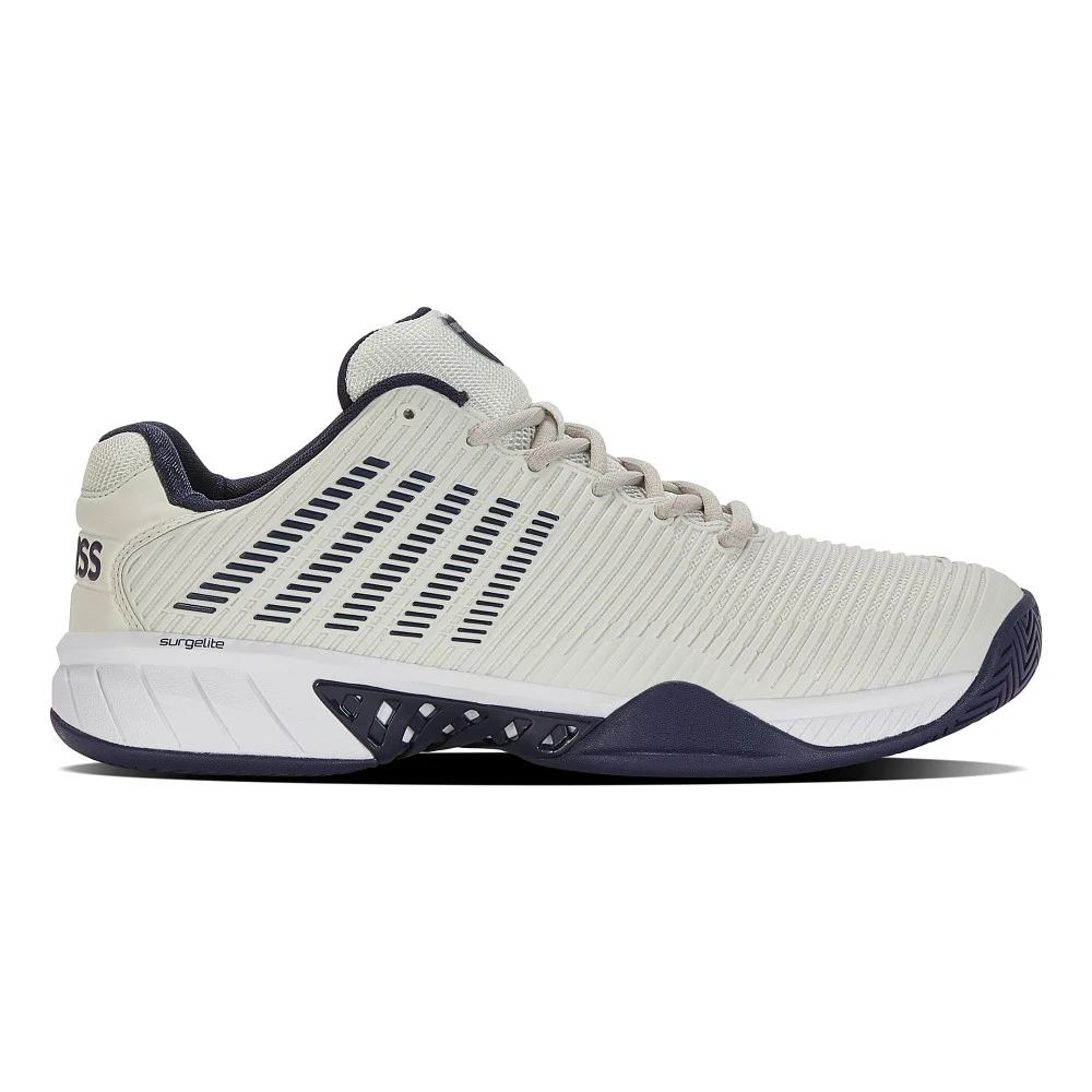 Men’s K-SWISS® HYPERCOURT EXPRESS 2 :: This shoe is a unicorn! Your updated Men’s K-SWISS Hypercourt Express 2 brings even more lightweight comfort to the courts than before while maintaining the breathable fit it’s known for! By introducing Durawrap flex technology and new Surgelite midsole cushioning, you’ll never worry about a break-in period – or an uncomfortable game. A synthetic leather upper and textile collar lining ensure durability while providing maximum comfort. Plus, an Ortholite x40 sock liner and molded rubber outsole guarantee long-lasting traction, making the Hypercourt Express 2 perfect for both casual play and hardcore training sessions no matter your skill level.