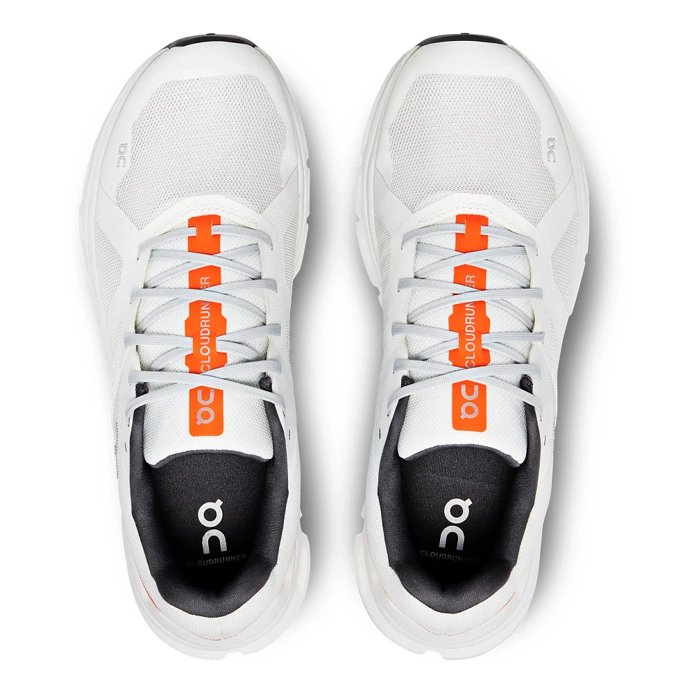 Men’s ON® CLOUDRUNNER :: Take impact out of the asphalt with your new Men’s On Cloudrunner running shoes. A wide Speedboard® gives you optimal balance and agility coupled with Cloudtec® in Zero Gravity foam absorbing both vertical and horizontal forces. The midsole cradles and cushions your foot while the foam collar and soft-touch tongue enhance the fit. Toes breathe easy with a ventilated engineered mesh upper that’s both functional and so, so soft. The grippy Cloudrunner outsole helps you feel secure and land with ease throughout all your running ventures.